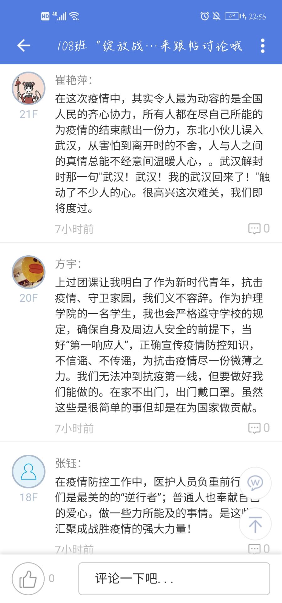 活动中,各支部结合本次团课主题,一起分享抗疫感人故事、感动瞬间和身边案例,一起针对责任担当、家国情怀展开讨论,一起学习习近平总书记回信精神......2018级护理学的杨佳佳同学说,在这场没有硝烟的战争中,涌现出一批批我们叫得出名字的抗疫英雄,还有更多的默默为这张战役奉献的无名英雄,他们都是中国精神和中国力量的体现!我身边的很多同学,在疫情中加入志愿者队伍,奉献自己的绵薄之力,他们的行动,同样让我敬佩!2019级护理学孙威威同跟大家分享说,他的母亲有着出色的裁缝手艺,在疫情中她加入口罩工厂生产大军中,用自己的方式为抗疫做贡献!2017级护理学李澳东同学说,从武汉封城,到火神山、雷神山医院的建成,到一省包一市的对口支援,无一不体现了我们国家的制度优势,身为中国人,我感到无比骄傲和自豪!