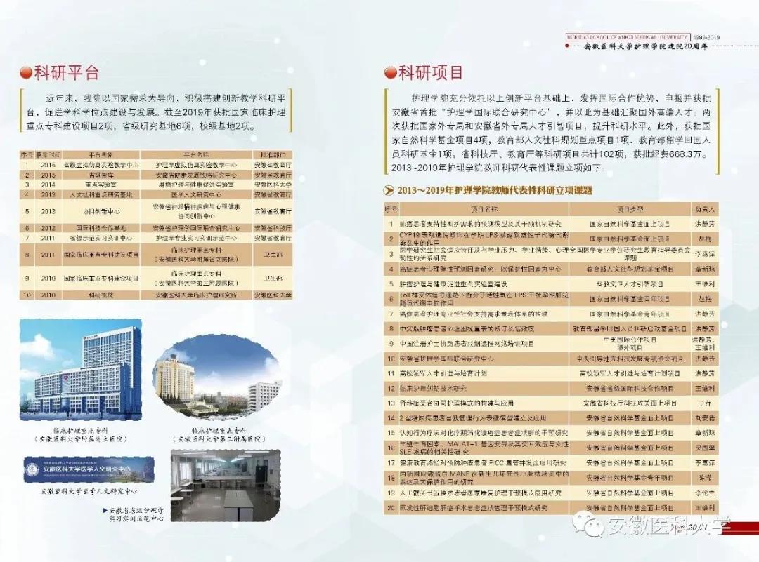 学院依托安徽省护理学国际联合研究中心、肿瘤护理与健康促进实验室、临床护理技术的创新研究等三个科研平台,整合国内外合作院校、附属医院和教学医院的优质资源,提升研究领域的持续创新能力。近五年,学院获批国家自然科学基金4项,教育部、省科技厅、教育厅等省部级以上项目54项;在国内外医学类期刊上以第一作者或通讯作者发表论文共计579篇,其中SCI论文46篇,中文核心期刊256篇。