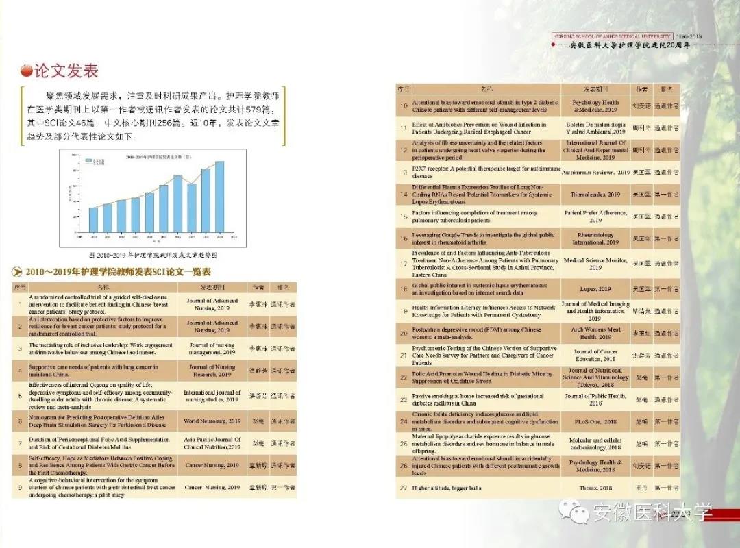学院依托安徽省护理学国际联合研究中心、肿瘤护理与健康促进实验室、临床护理技术的创新研究等三个科研平台,整合国内外合作院校、附属医院和教学医院的优质资源,提升研究领域的持续创新能力。近五年,学院获批国家自然科学基金4项,教育部、省科技厅、教育厅等省部级以上项目54项;在国内外医学类期刊上以第一作者或通讯作者发表论文共计579篇,其中SCI论文46篇,中文核心期刊256篇。