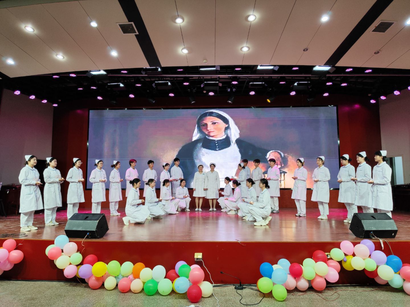 为迎接第112个国际5·12国际护士节,赞颂和传承现代护理学科创始人南丁格尔救死扶伤的人道主义精神和为护理事业无私奉献的精神,培养学生大爱无疆的人文情怀,在深入开展学习贯彻习近平新时代中国特色社会主义思想主题教育之际,鲸鱼直播足球 于5月11日晚在南校区多功能报告厅隆重举办了“白衣翩跹,青春礼赞”护士节文艺晚会。学院党委书记赵云峰、院长洪静芳、党委副书记王磊、副院长赵梅、副院长李树雯及全院师生出席本次晚会。