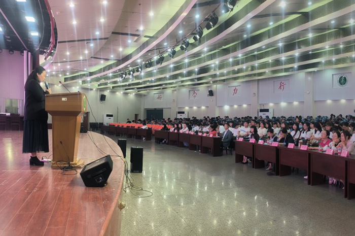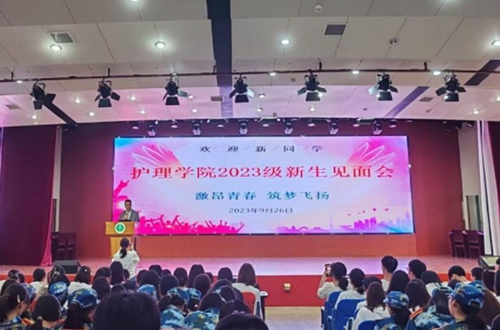 洪静芳为新生作了题为《惟健康承载幸福,以奋斗成就未来》的入学教育报告。她以“何为守护”这一问题切入,引发学生们思考,并围绕护理学等专业的专业价值、人生价值、社会需求,以及学院声誉、教学资源、科学研究、合作交流等,对同学们进行专业思想教育。她鼓励新生们在未来的学习和生活中要树立目标、强身健体、心怀感恩、承担责任,为实现护理事业的发展作出贡献。
