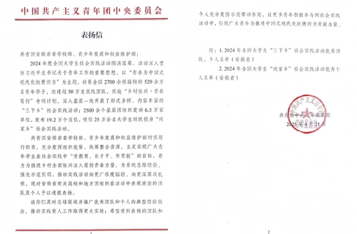 近日,共青团中央青年发展部发来表扬信,我校“天使护蕾”暑期社会实践团获得2024年全国大学生“三下乡”社会实践活动优秀团队。