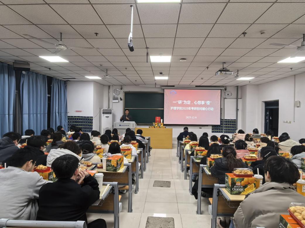 慰问活动现场氛围温馨融洽,暖意融融。学院为每一位考研学子精心准备了专属 “考研暖心三件套”—— 香甜软糯的泡芙寓意 “全力以赴,甜蜜收官”,暖心暖胃的奶茶承载 “温情相伴,蓄力前行”,而色泽鲜亮的橙子则寄托了学院 “心想事‘橙’,金榜题名” 的美好祝福。学院领导与老师亲手将这份满载关怀与期许的礼物送到每位同学手中,一句句暖心的鼓励、一声声真挚的祝福,让同学们在紧张的备考氛围中感受到了家一般的温暖与强大的精神鼓舞。同学们收到慰问物资后,脸上洋溢着感动的笑容,纷纷表达了对学院的衷心感激。大家表示,在考研冲刺的关键节点,学院的关怀犹如冬日里的暖阳,驱散了备考的疲惫与焦虑,给予了他们勇往直前的力量,他们将全力以赴、奋勇拼搏,力争在考研中取得优异成绩,不辜负学院的悉心培养与殷切信任。